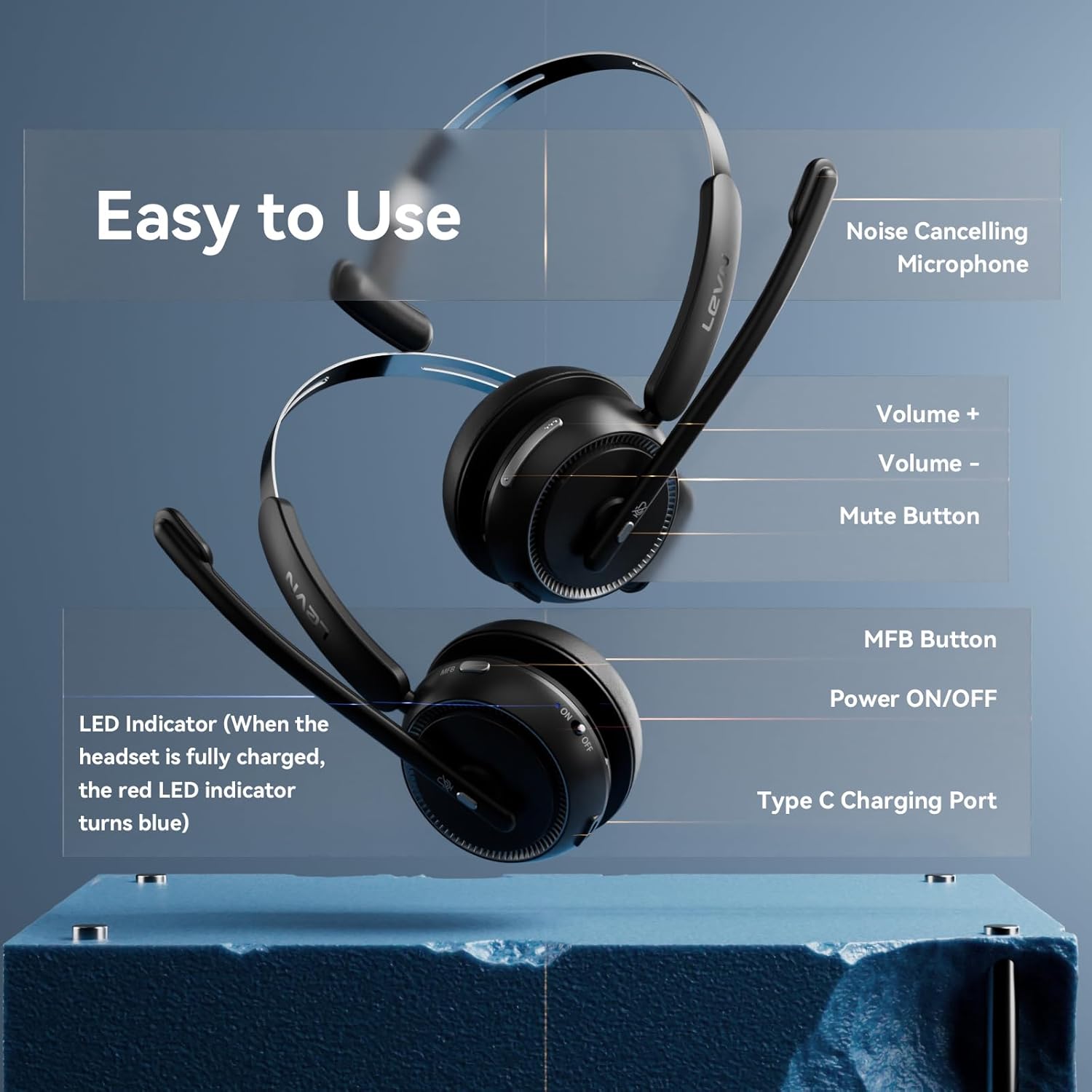 11 LEVN Wireless Headset Bluetooth Headset with Noise Cancelling Microphone for Work