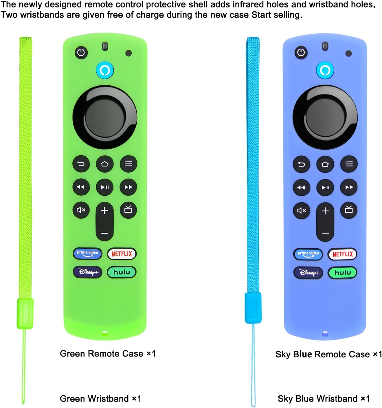 [2 Pack] Pinowu Firestick Remote Cover Case (Glow in The Dark) Compatible with Firetv Stick Alexa Voice Remote 3rd Gen, Silicone Sleeve with Wrist Strap (Green & Blue)