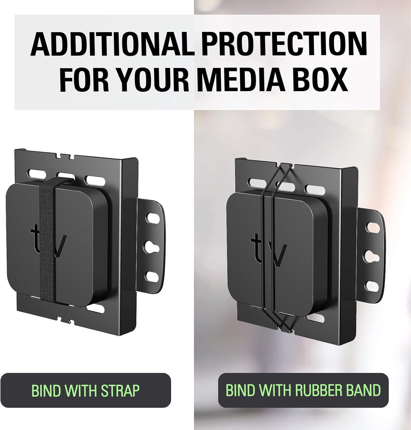 [SOLID AND SAFE CONSTRUCTION] TV top shelf holder is constructed of high quality cold-formed steel for the ultimate in safety and reliability. Including a strap and a rubber band provide additional protection for your media box.