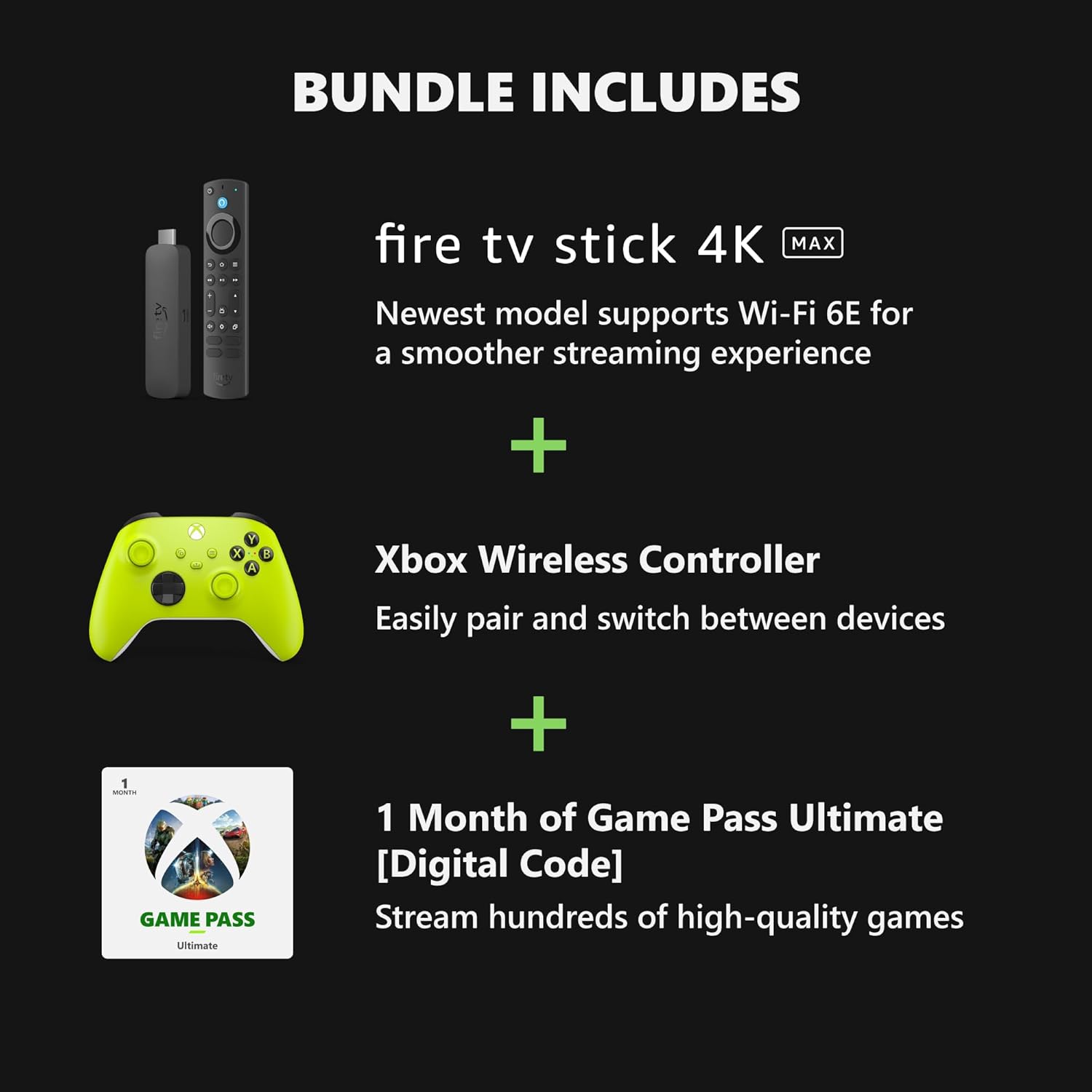 BUNDLE INCLUDES: Install the Xbox app and start playing, including a Fire TV Stick 4K MAX, an Xbox Wireless Controller, and 1 month of Xbox Game Pass Ultimate [Digital Code].