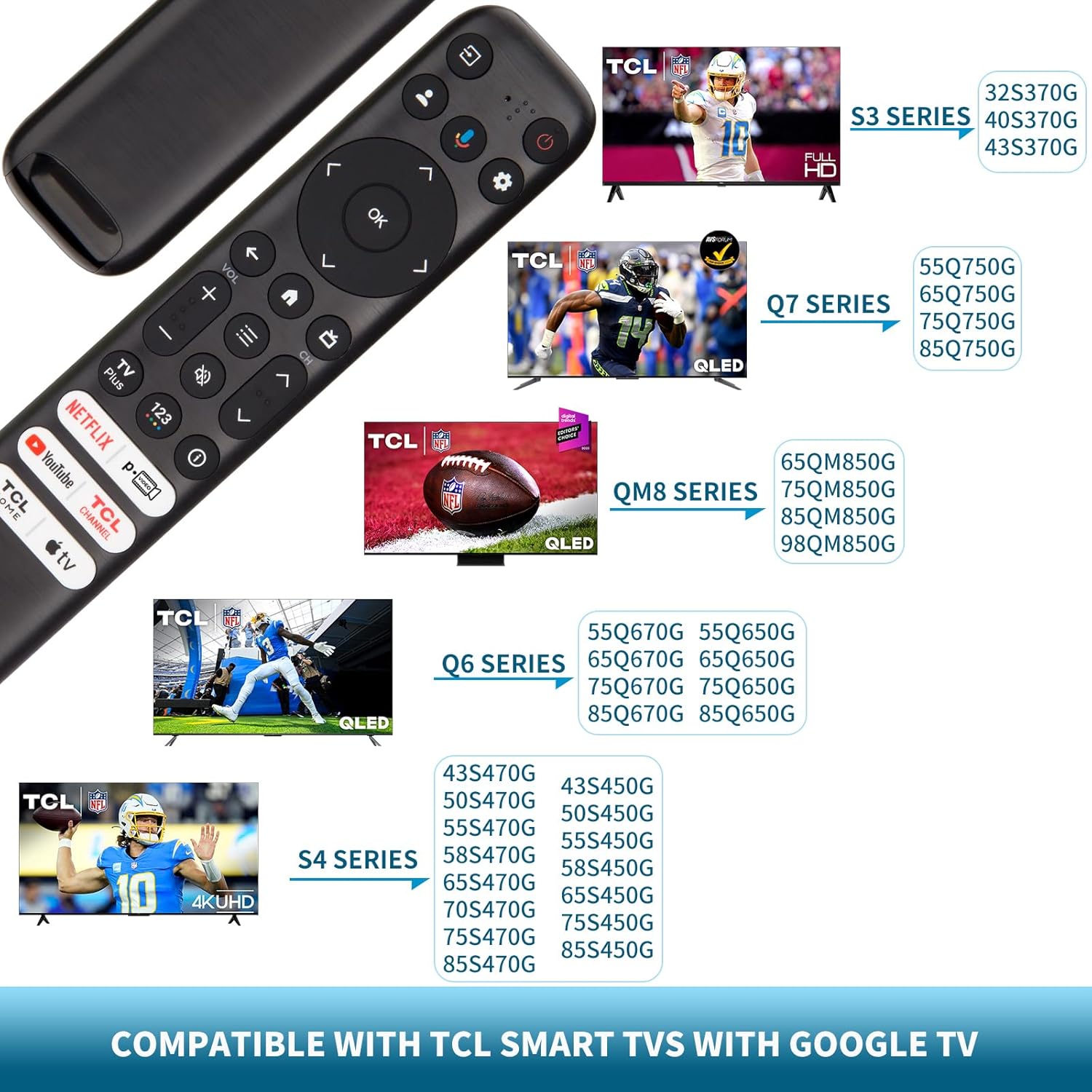 【Support TV Models】 Replacement RC813 voice remote control compatible with TCL TV Q6 series: 55Q670G 65Q670G 75Q670G 85Q670G 85Q650G 75Q650G 65Q650G 55Q650G, Q7 series: 55Q750G 65Q750G 75Q750G 85Q750G, QM8 series: 65QM850G 75QM850G 85QM850G 98QM850G, S3 series: 32S370G 40S370G 43S370G, S4 series: 55S470G 43S470G 50S470G 58S470G 65S470G 70S470G 75S470G 85S470G 43S450G 50S450G 55S450G 58S450G 65S450G 75S450G 85S450G etc.