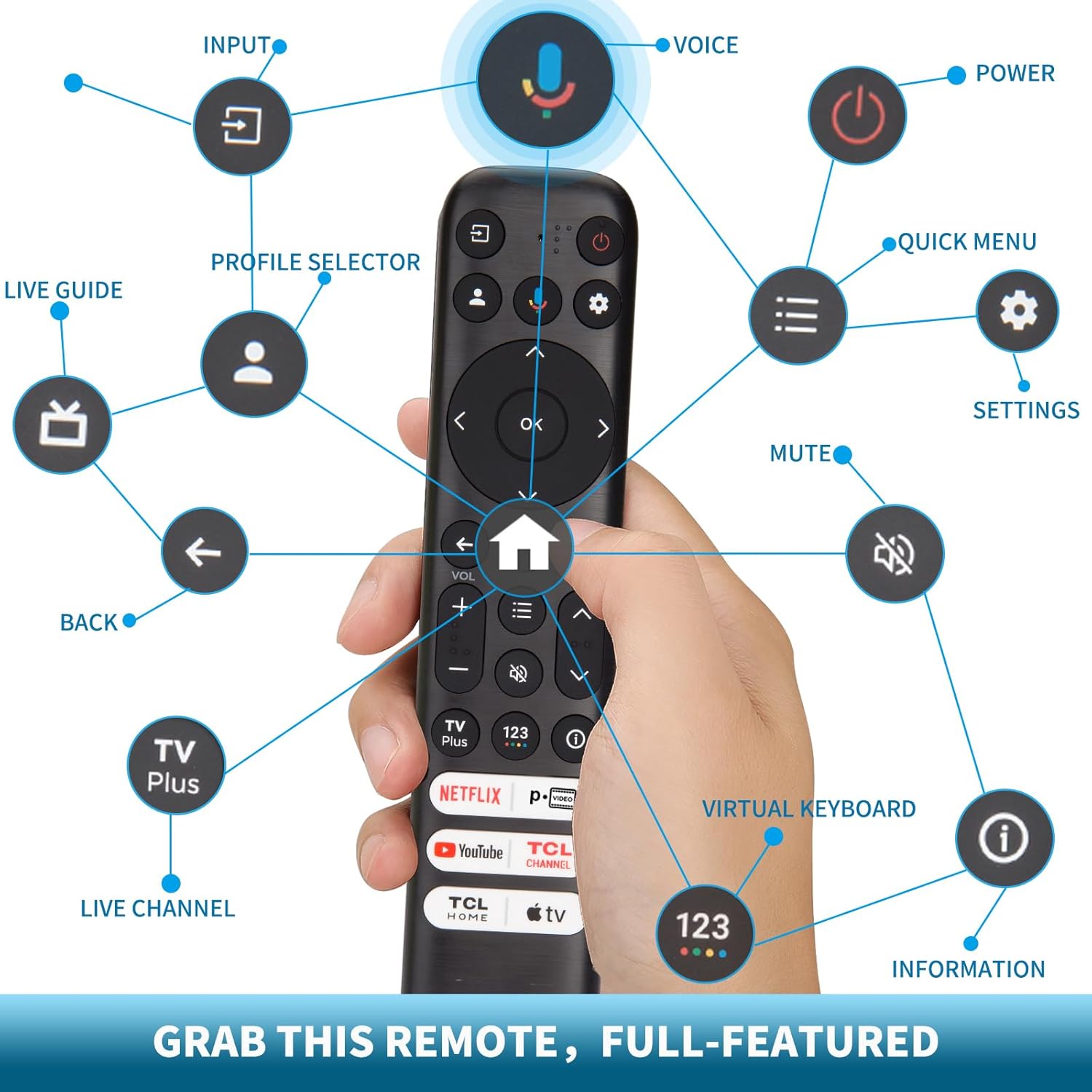 【With 6 Shortcut Buttons】New upgrade voice remote control comes with 6 app buttons, you can switch to your favorite channel conveniently by pressing Netflix, p-video, YouTube, TCL Channel, TCL Home and apple TV+.